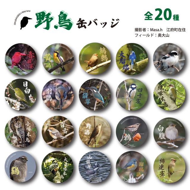 鳥取県江府町は野鳥の宝庫。地元写真家の熱がこもった、野鳥の魅力を缶バッジに仕上げました。お土産、コレクションにぜひどうぞ。サイズ44mm×44mm アカショウビン、キビタキ、ミソサザイ、オオルリ、エナガ、メジロ、ジョウビタキ、シジュウカラ、アオゲラ、コゲラ、モズ、ノビタキ、ツグミ、シロハラ、ハイタカ、オオアカゲラ、ヤマセミ、ルリビタキ、ヒレンジャク、カワセミの全20種 撮影:masa